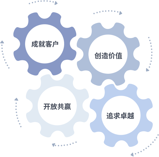 成就客户是一切决策的出发点,,创造价值是衡量所有工作的标准,,,追求卓越是我们做事做人的态度,,,,开放共赢是我们的格局也是最终的结果。。。价值观的齿轮环环相扣,,,,推动着组织里的每个人不断向前。。